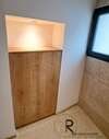 Fermeture d'un sas d'escalier par une porte pivotante et porte coulissante. L'ensemble a été fabriqué à l'atelier, plus de 100 tasseaux en chêne massif huilé...