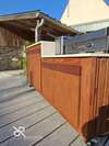 Fabrication d'une cuisine d'extérieure sur mesure en douglas, sipo et plan céramique.
